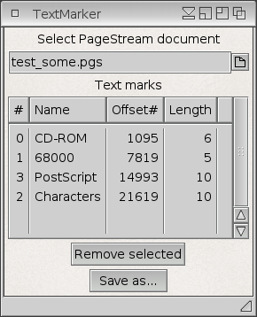 From the readme: PageStream 4 has no feature to remove added text marks in the document. This tool loads any PageStream document and lists text marks found in that document. The selected text marks can be removed from the list and a new document can be saved with untouched content except the text marks.